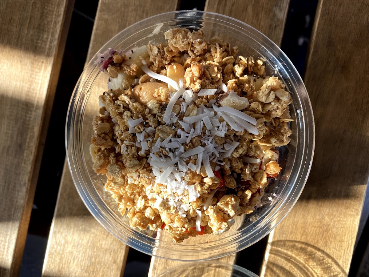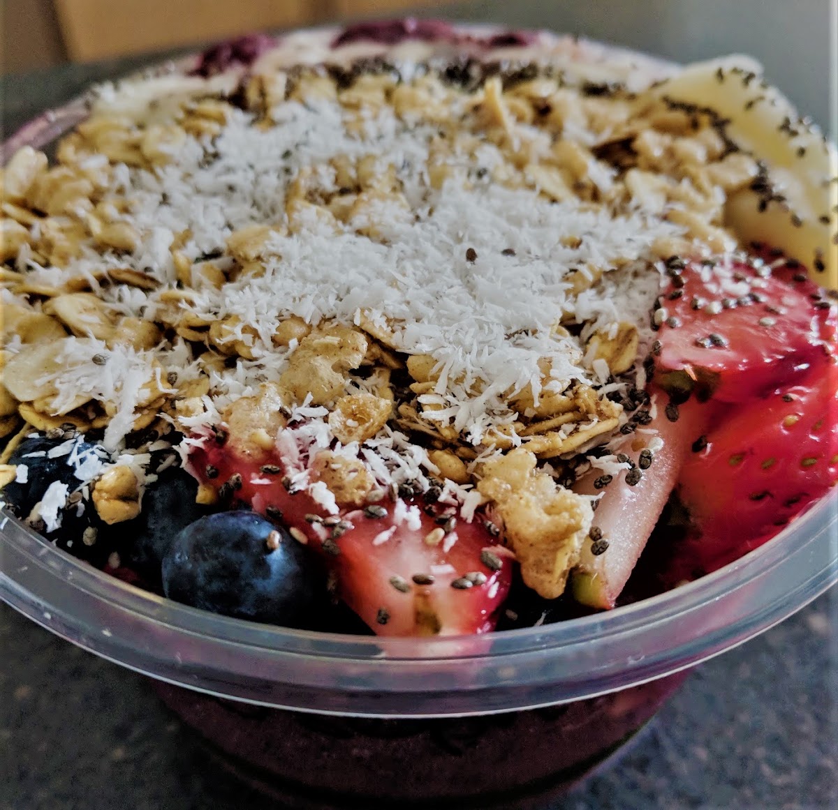 Vegan. Choose a base: Acai Berry. Would you like to add toppings?: Add Granola, Add Banana, Add Strawberries, Add Chia Seeds, Add Peanut Butter, Add Coconut Flakes